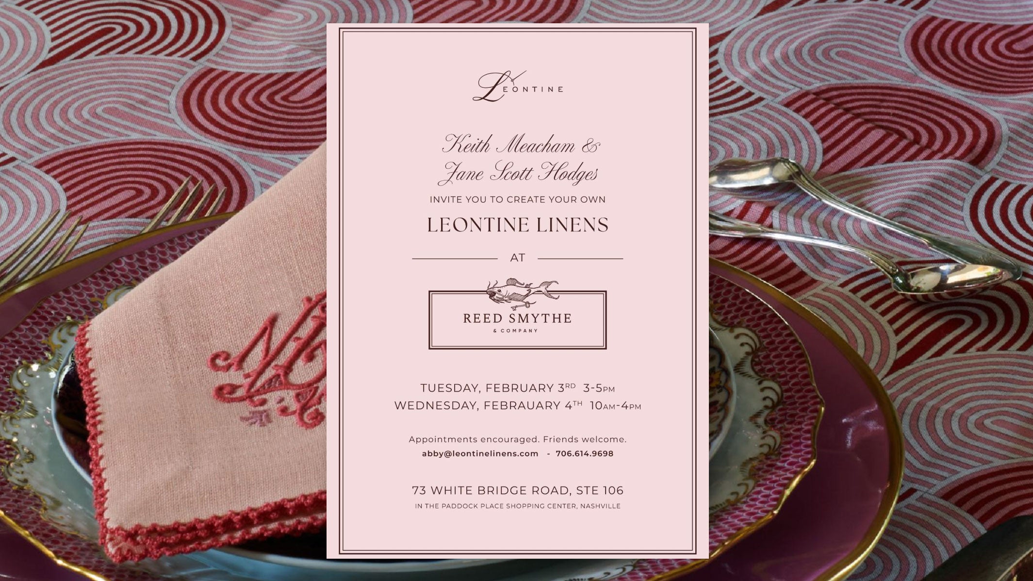 Stop by both days to meet Jane Scott Hodges and to browse Leontine Linens' collection of bespoke monogrammed napkins, bedding and more. Private appointments recommended. Contact abby@leontinelinens.com