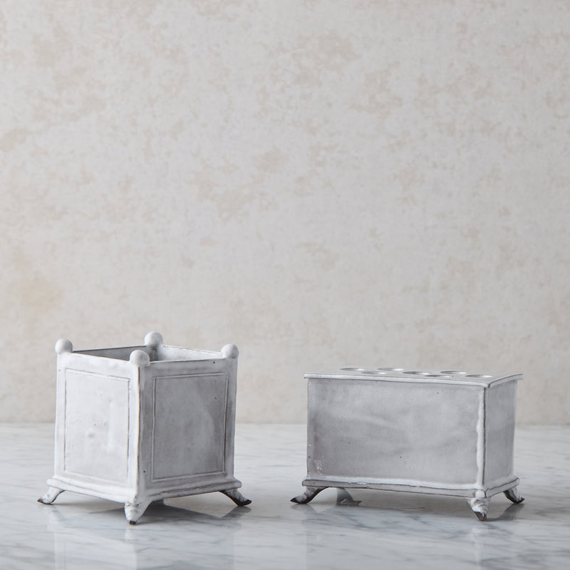 This petite cachepot is carefully built by hand using sculpted pieces of handmade stoneware washed with a refined white glaze that allows the underlying dark earthy clay to create a gorgeous patina. Resting on tiny coquillage feet, it is a diminutive piece that makes a big impact. A handy hole in the bottom allows for easy use as a planter for herbs or small potted primroses. Add a small plastic liner and arrange flowers for a bedside table or powder room.
